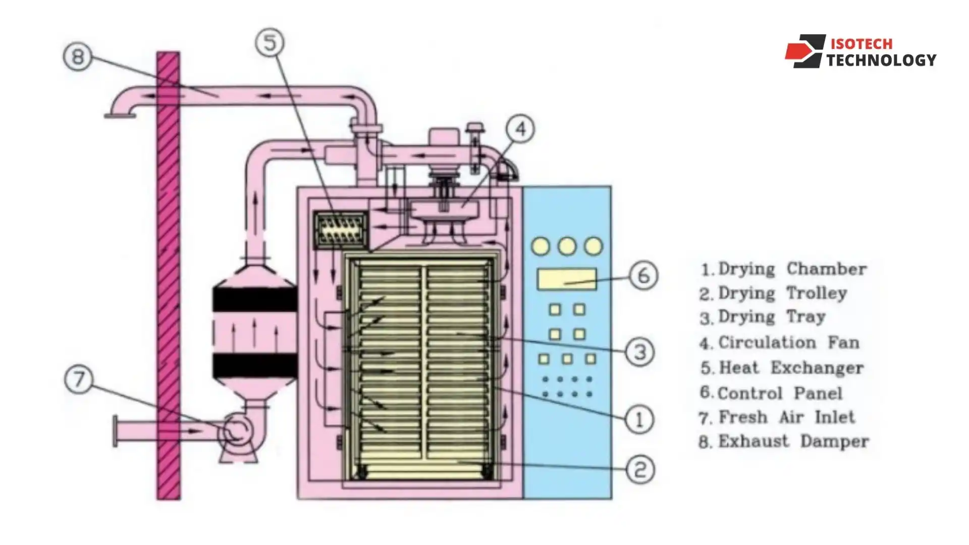 The outlet is used to release moist air. For consistent drying, a constant temperature and uniform air flow across the materials can be maintained.